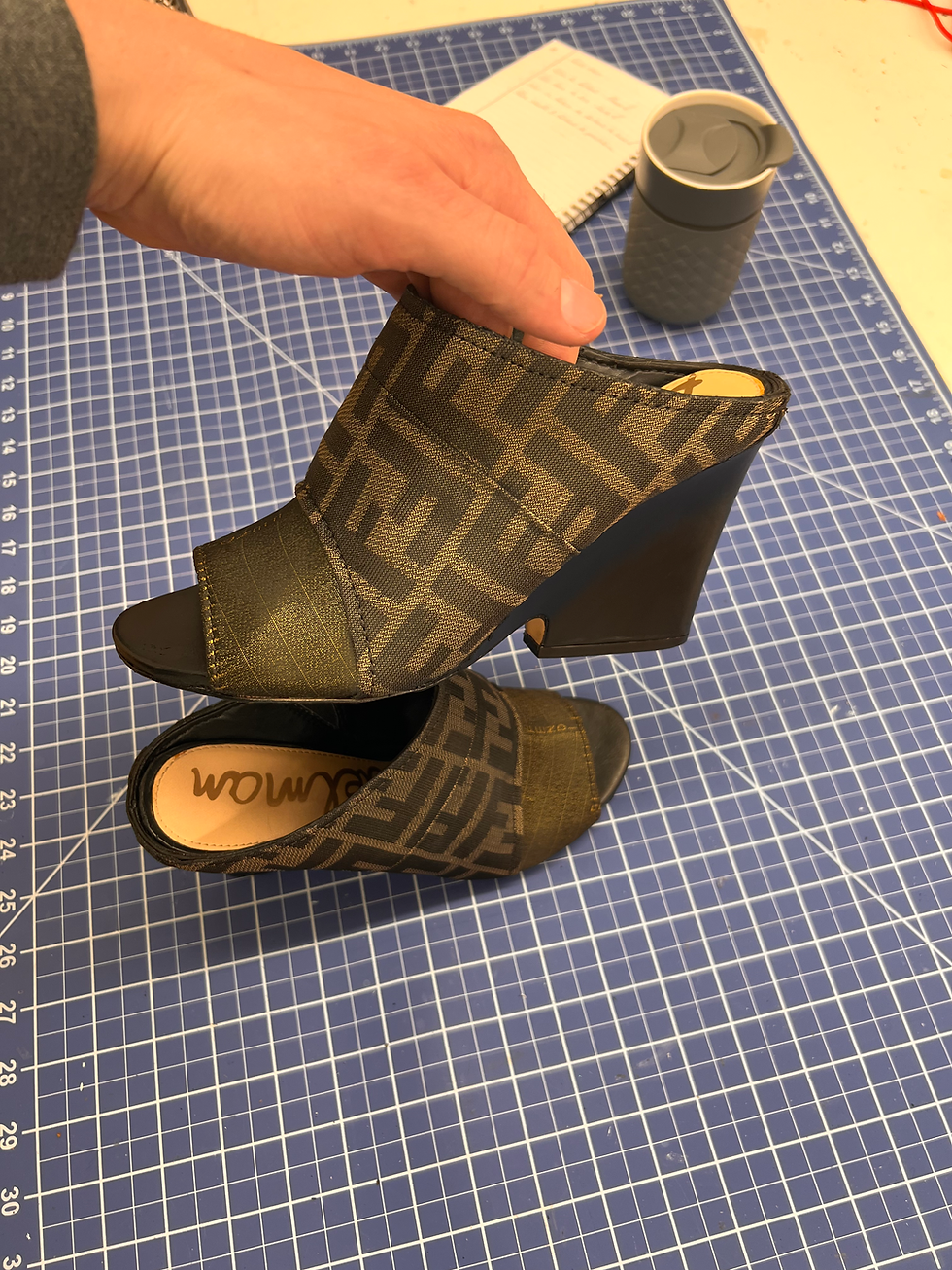 Made from a Fendi Bag. The client contacted me with a request to make a Custom Fendi Heel from scratch. I first measured the client, then constructed a prototype with a similar material. After the prototype was established I drafted the master pattern. The pattern was then cut, sewn, and formed for the final fitting and assembled to the heel. The Exterior features the Fendi bag and the interior is lined with a buttery soft Italian lamb. Designed, drafted, cut, & sewn.